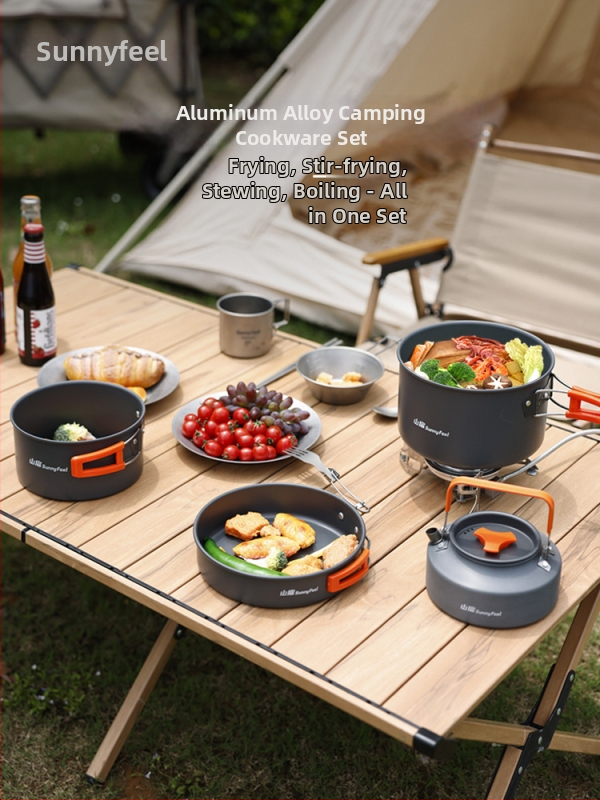 Kempinges edénykészlet, 4 darab – alumínium ötvözetből készült edények: teáskanna, nagy edény, közepes edény és serpenyő; hordozható, ultra-könnyű, 4–7 főre