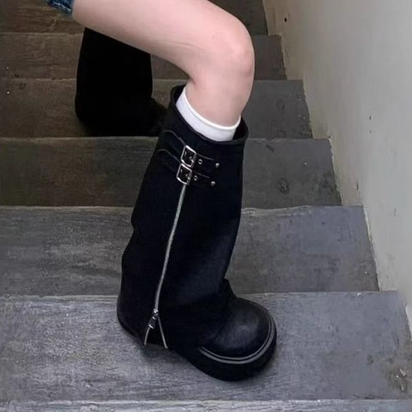 Vastag talpú magas szárú csizma PU felsőrésszel, gumírozott talp, kerek orr, masszív 6–8 cm-es sarok, oldalsó cipzár